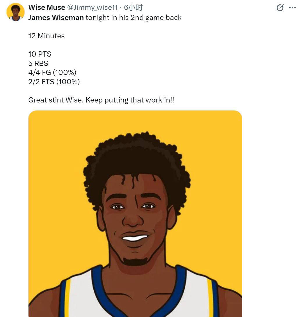 北京时间10月12日,NBA季前赛中,步行者以116-101大胜雷霆,尽管两队主力都选择休战。步行者队中的中锋怀斯曼在本场比赛中作为替补出场12分钟,在四次出手中全部命中,罚球也全中,最终贡献了10分5篮板1失误,个人正负值为-1。
