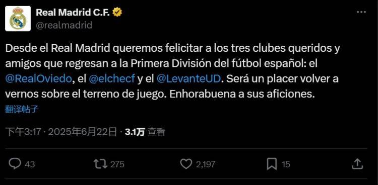 皇马写道:“代表皇马,我们想向三家备受喜爱并与我们友谊深厚的俱乐部致敬:莱万特、埃尔切和皇家奥维耶多,它们即将重返西甲联赛。”